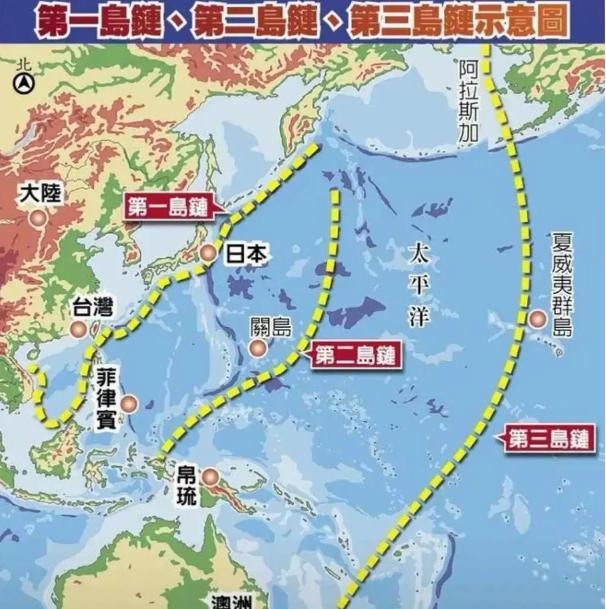 这个"岛链"战略的核心,就是利用西太平洋上的岛屿群构建三道防线。第一岛链从日本延伸到台湾,再到菲律宾,俨然一条锁链,企图把我们锁在近海。