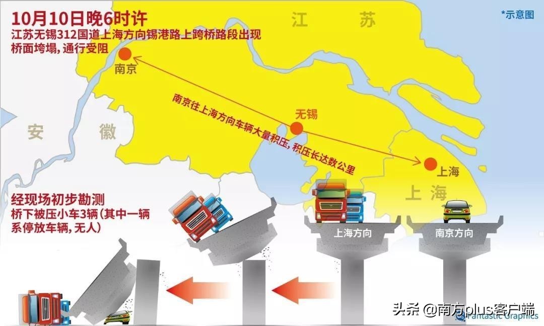 10月10日晚6点6分,江苏省无锡市312国道上海方向K135处、锡港路上跨桥出现桥面侧翻,整体坍塌,桥面上的一辆卡车沿倾斜桥面滑落。