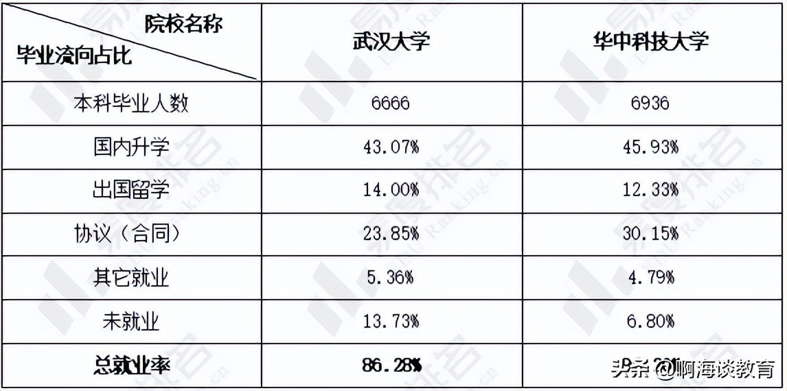 我们现在来看看两校毕业生的就业与升学情况;这是本科教育非常重要的数据,也是与学生切身利益息息相关的。由于两校的招生规模都比较大,数据还是有一定的参考价值的。按照两校2025年的本科毕业生流向数据,综合性高校的武大在协议就业率、国内升学率上要明显低于理工科高校的华科,这是学科属性决定的结果,文史哲学科的就业难度都非常高,理工科高校在升学与就业方面的优势都比较明显;具体见图表。