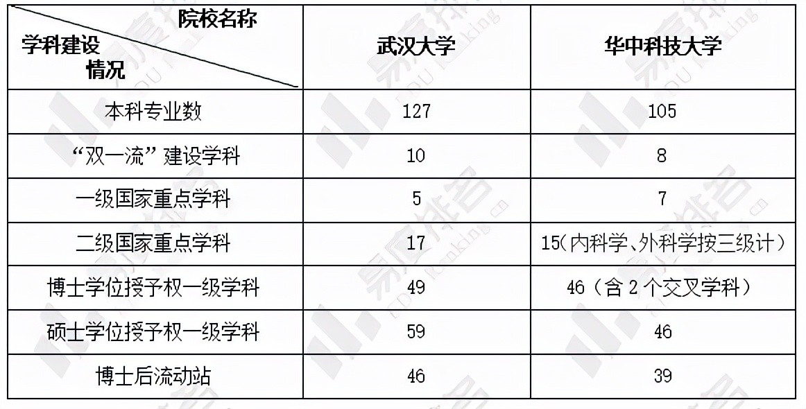 在整体办学规模上武大还是要强一点的;从双一流学科数量、一级国家重点数量、一级学科博士点与一级学科硕士点建设的情况看。武大都是处于领先地位的,这是综合性高校武大的绝对优势,理工科高校在这方面都是处于相对劣势的位置;具体数据见表格。