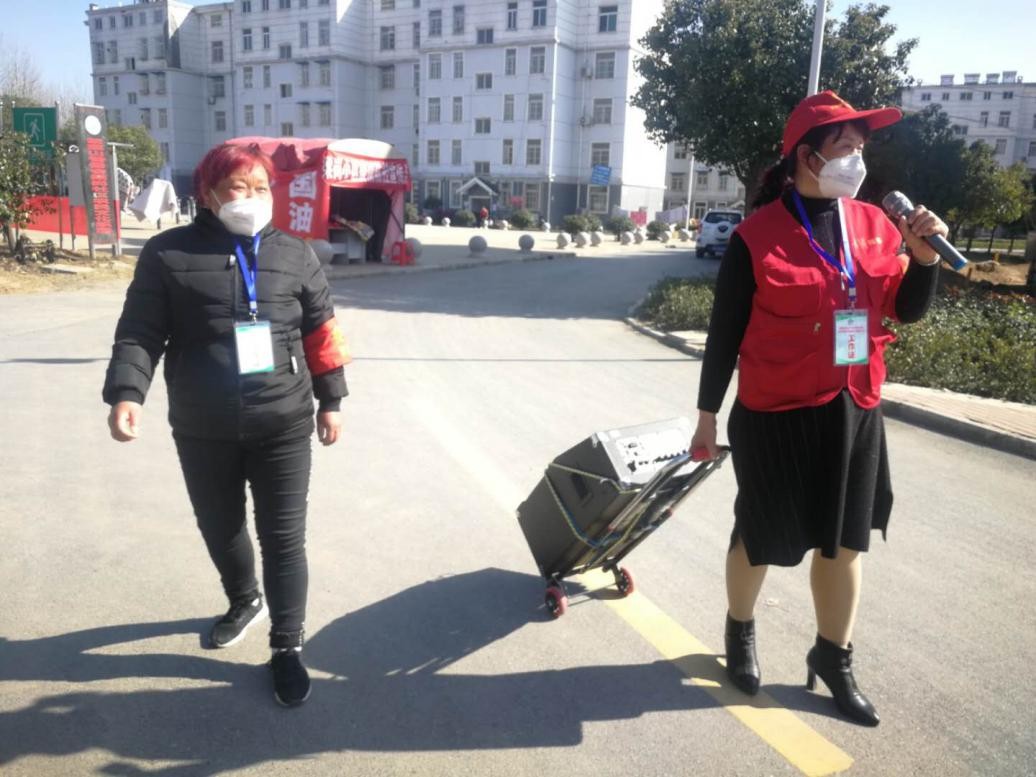 (梁岗社区程绍芳用广播劝导居民少出门、不聚会)