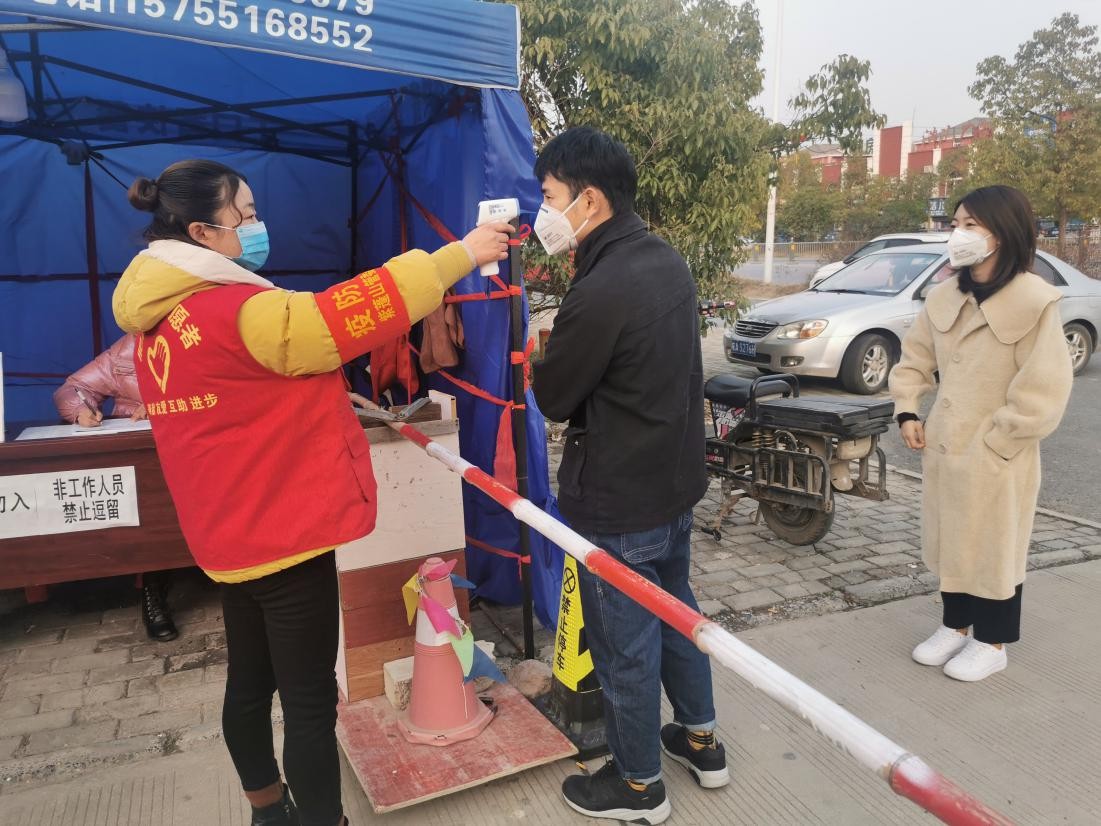 (堰湾社区龙如环为进出人员测体温)