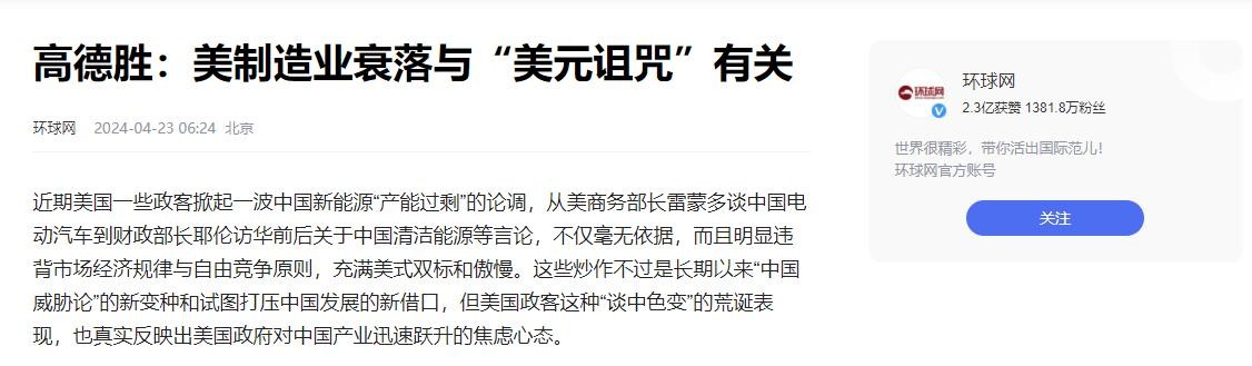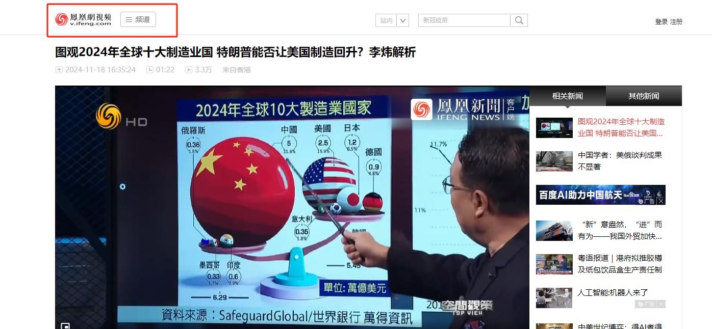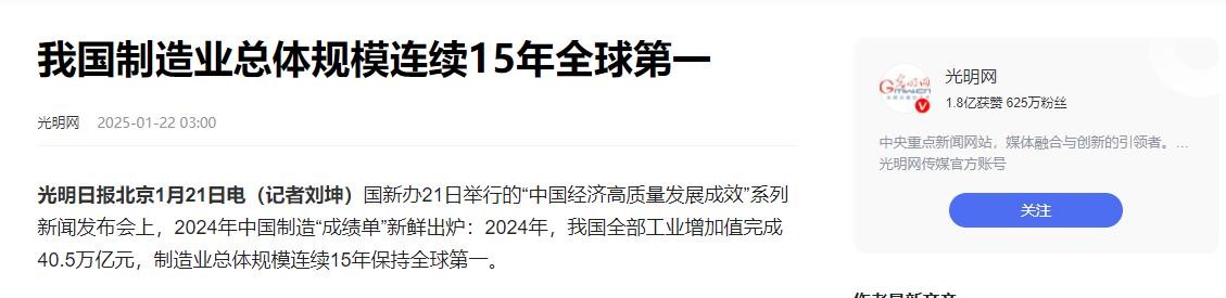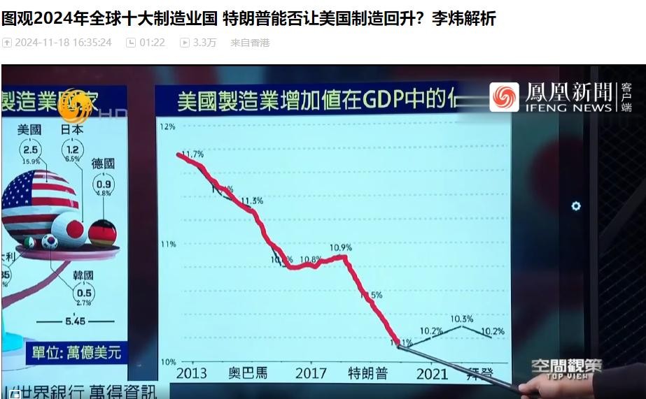 据凤凰网的数据来看,2024年全年,美国的制造业在全球市场份额上占了15.9%,其次便是日本的6.5%,德国也只有4.8%。