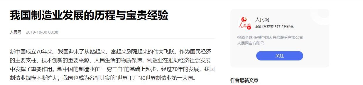 中国制造正从"大而全"向"强而精"转型,虽然一些制造业中仍存在核心零部件依赖进口、品牌附加值较低等短板,但相信,未来中国制造业一定会继续攀升。