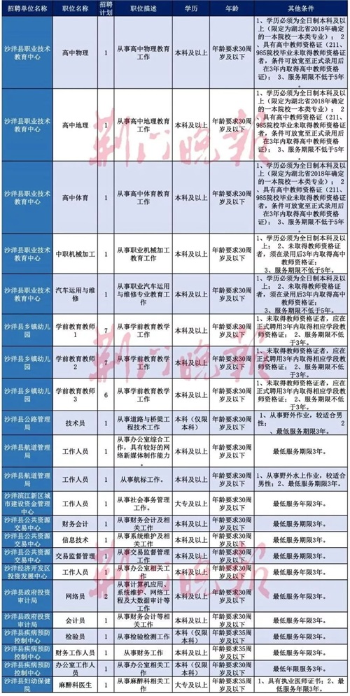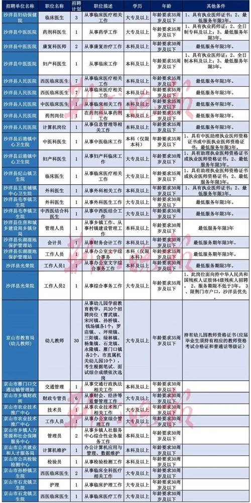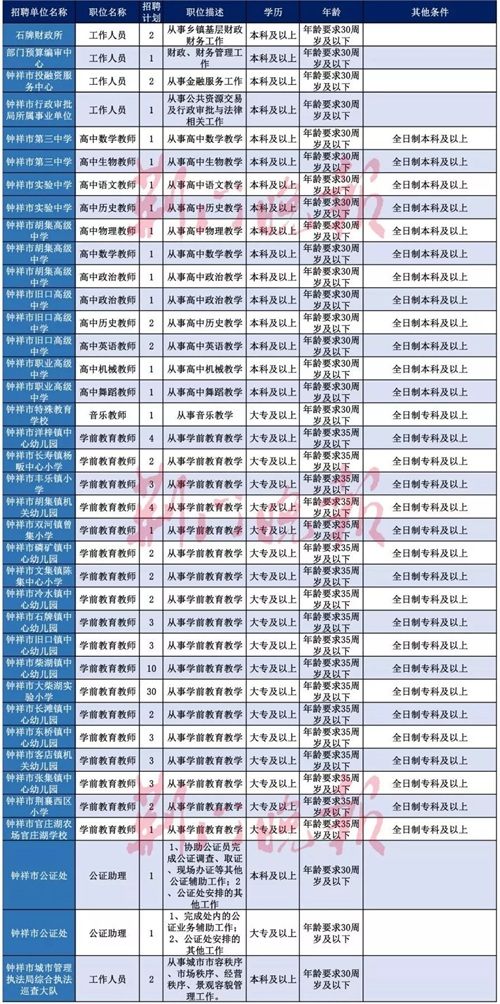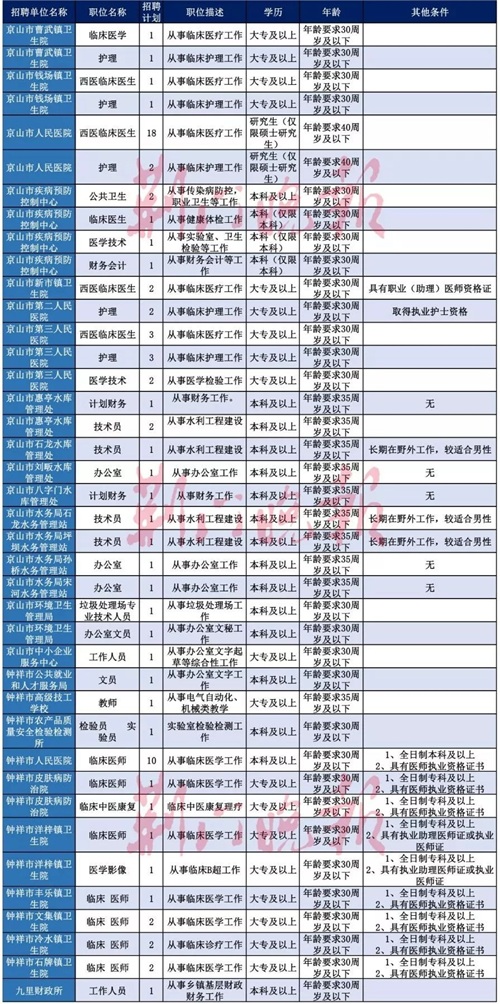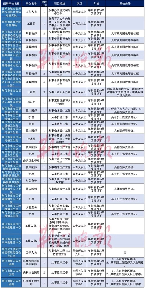 从昨日发布的岗位表上,小编看到,今年的公开招聘岗位以教师、医生等关乎民生的岗位为主,并向基层倾斜。如京山市教育局招聘30名幼儿教师,钟祥市大柴湖实验小学招聘30名学前教育教师,钟祥市人民医院招聘10名临床医师等。
