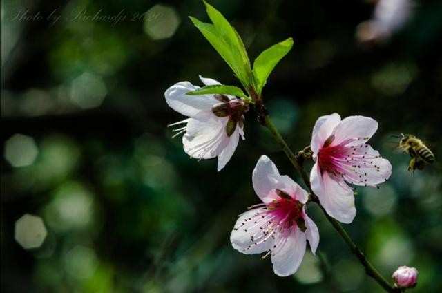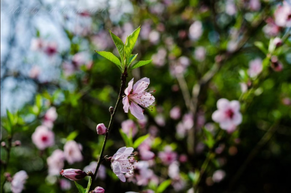 我心目的桃花和诗人眼中的桃花可不一样,由于家门口种了几株桃树,桃树有毛桃、油桃、寿星桃、碧桃、水蜜桃、大蟠桃等果桃,所以一到三月,各种颜色的桃花,不约而同地露出脸来。有的含苞欲放,有的迫不及待的张开了粉红的脸,还有的三五成群,娇羞的躲在一、两片提早出来溜达溜达的桃叶后面,还有的脸都涨的绯红,就是嘟嘟嘴,不肯露出笑脸。是不是在等它的如意郎君的到来,才会微微露出笑脸?