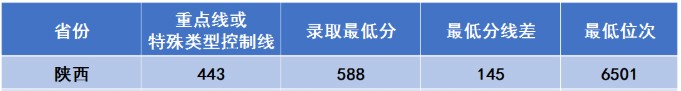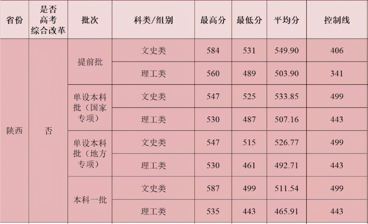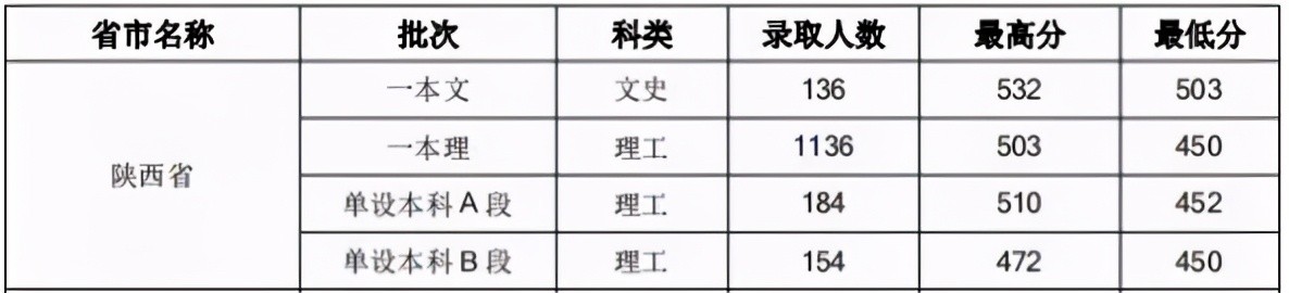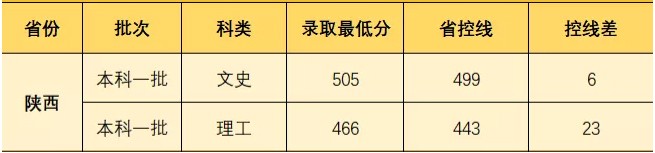 陕西本科一批录取正式投档理工类、文史类录取最低分分别为456和505,分别超出省控线13分和6分,理工类提升700位次左右,文史类基本持平。