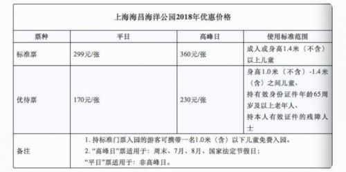 上海海昌海洋公园2018年实施优惠价,平日标准门票价格为299元/张,平日优待门票价格为170元/张;高峰日标准门票价格为360元/张,高峰日优待门票价格为230元/张。