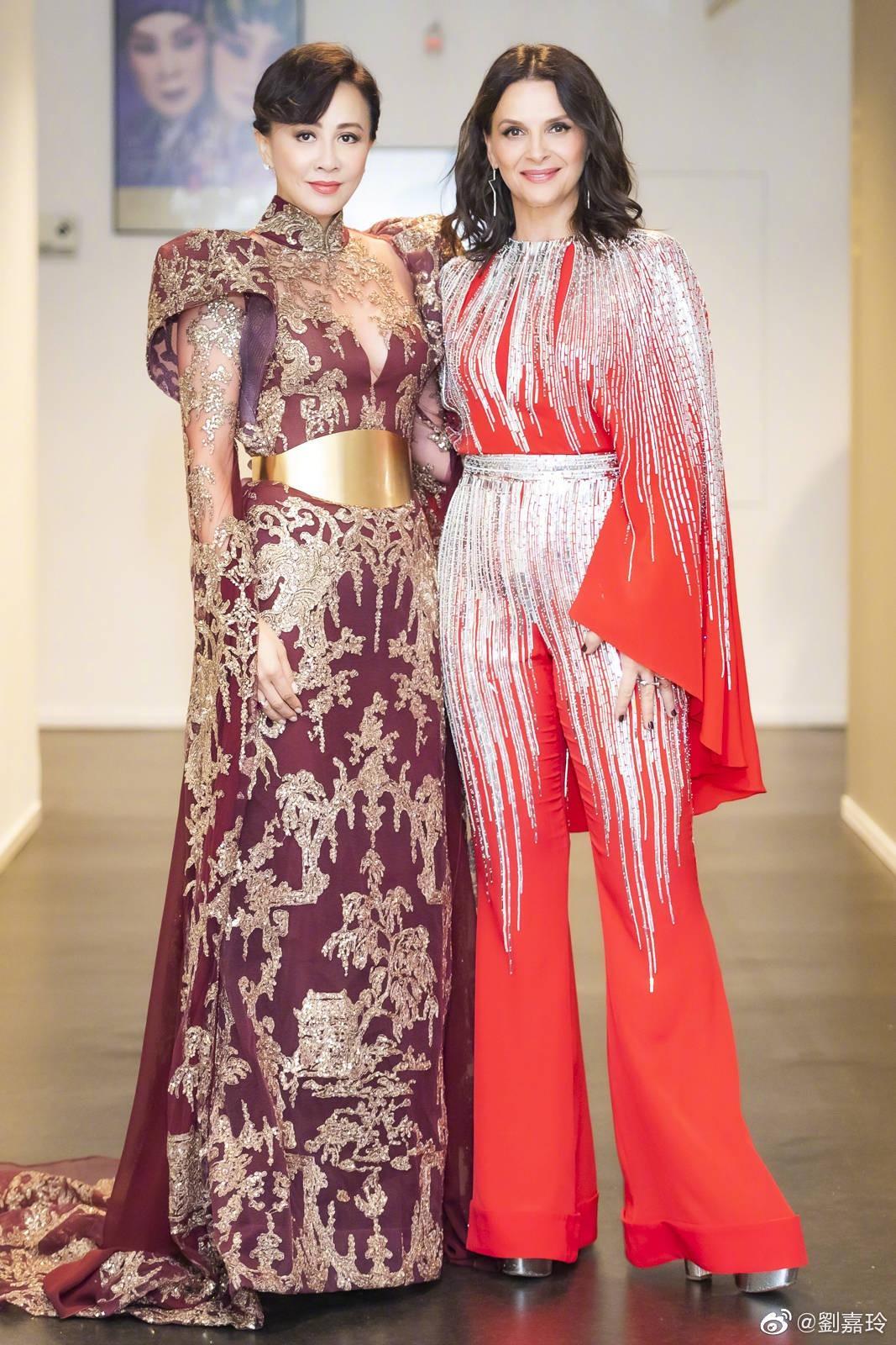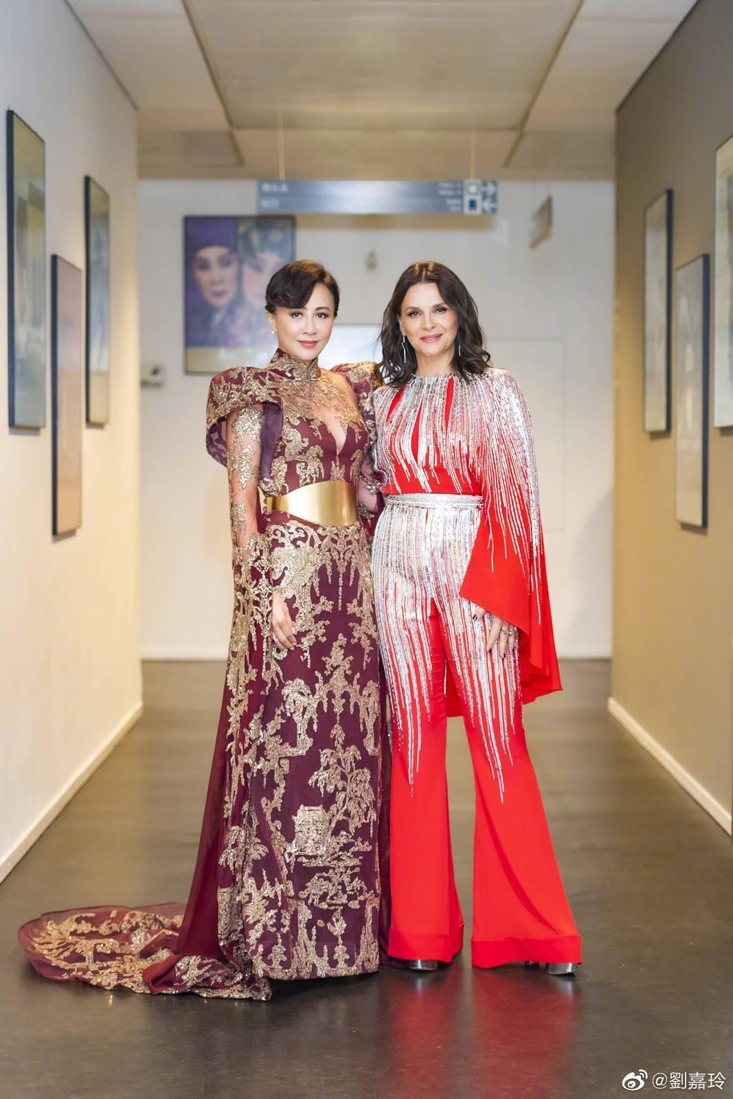 刘嘉玲金丝网纹低胸装变女王,与朱丽叶同框合影,东西方气质碰撞