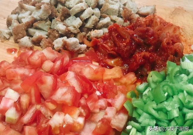 1、首先在锅中倒油,依次加肉类、蔬菜翻炒,再加米饭,加入葱、青椒、泡菜、肉丸碎、番茄即可;