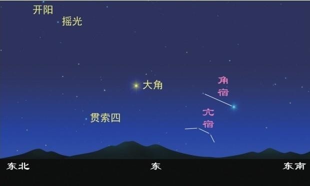 大角:共1星,后增2星,属于牧夫座。是苍龙的角,代表帝座。大角本为角宿星官之一,是青龙的大角尖端,由于它最亮角宿才得以列二十八宿之首,后因其入亢宿2.5度改入亢宿。