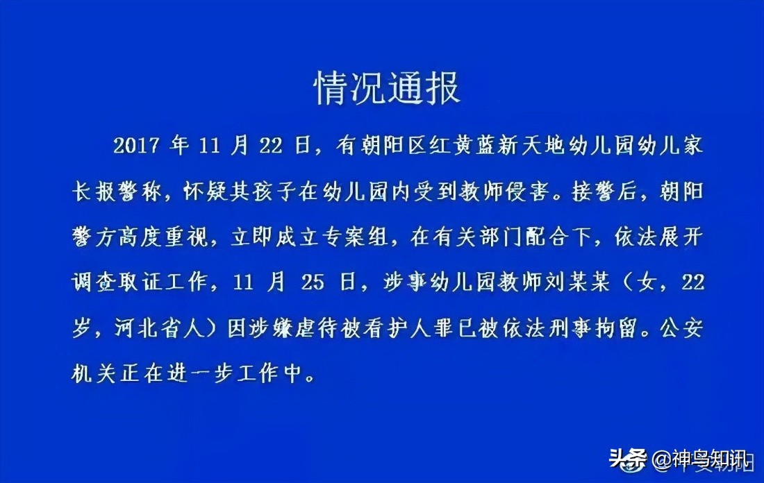 11月25日,北京警方就该幼儿园幼儿疑似遭针扎、被喂药一事进行了通报,涉嫌虐童的幼儿园教师刘某某被刑拘。