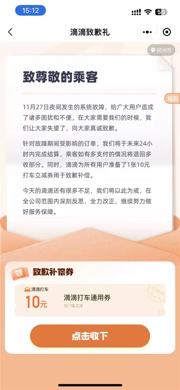 11 月 29 日,滴滴宣布向所有用户发布 10 元打车立减券。