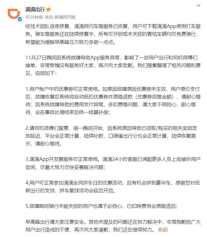 11 月 27 日晚间,众多乘客、网友在社交媒体反馈:滴滴崩了!