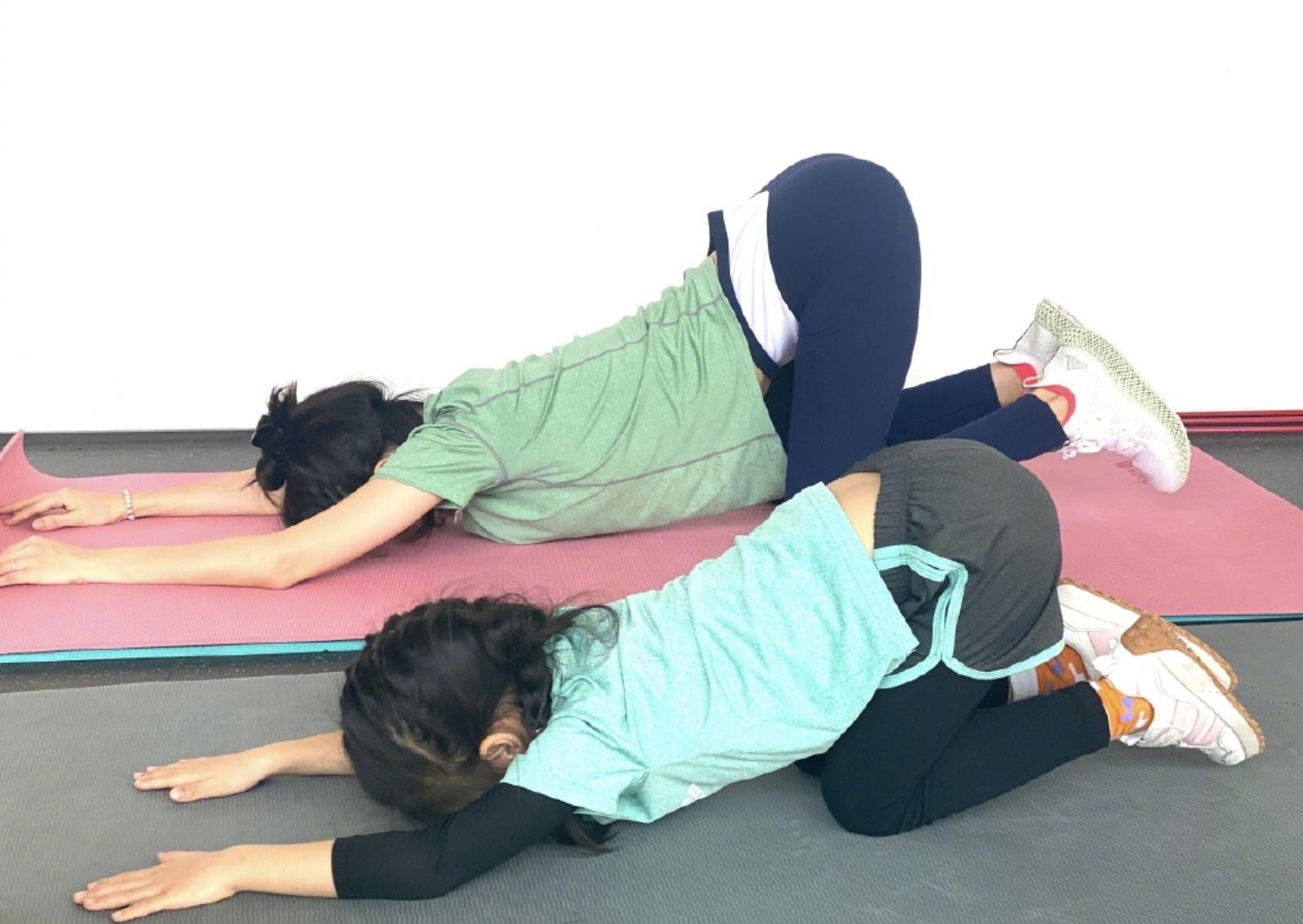 醒宝还学起了妈妈做下犬式的动作,姿势一样的标准。
