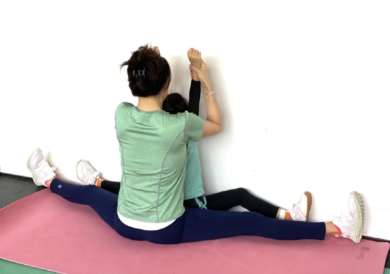 醒醒坐在瑜伽毯上,轻松展示一字马,两手放在墙面上,妈妈在身后监督。