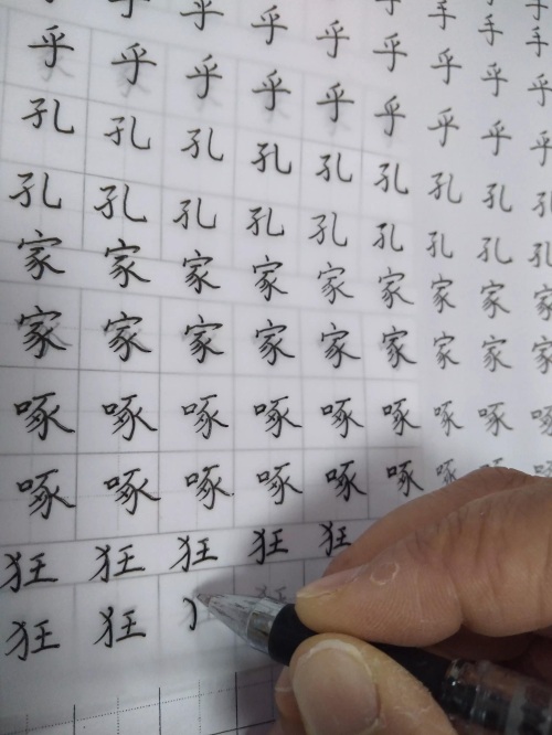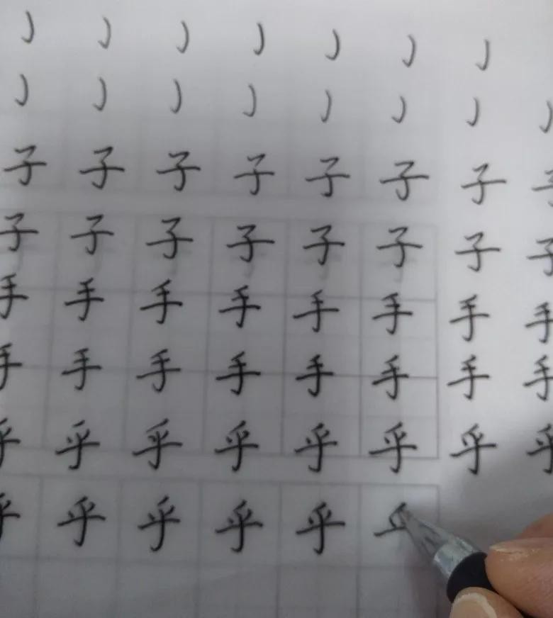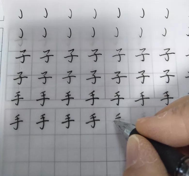 “手”字:横向等距,上紧下松,长横平分整个字。在“手”字里弯钩较长,所以很接近竖勾。弯钩上下对正。
