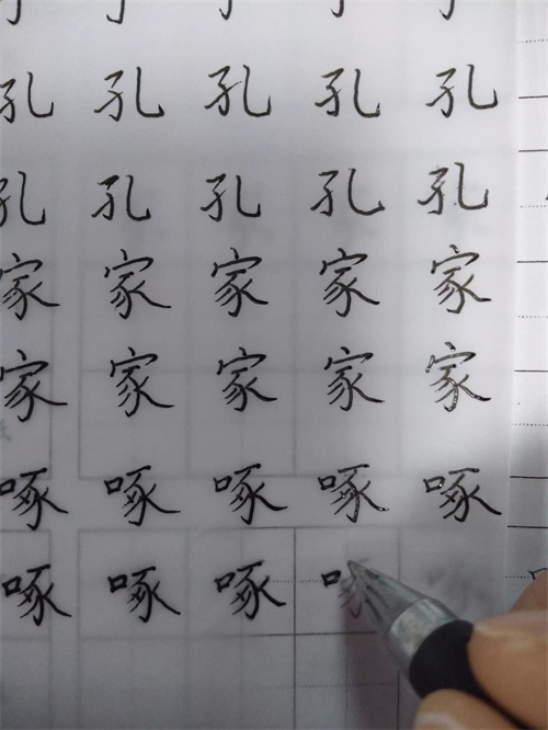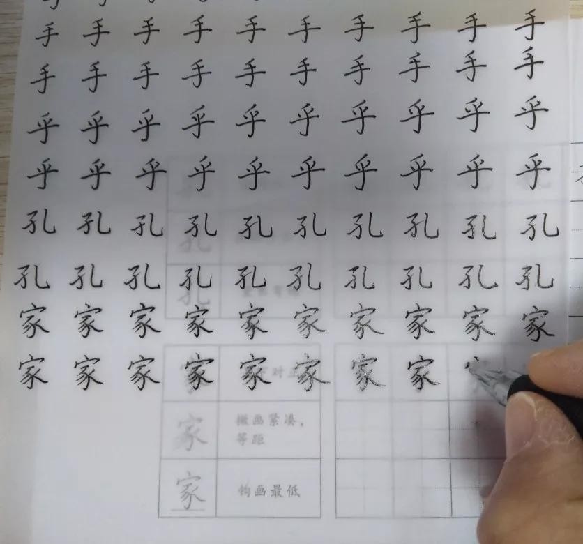 “家”字:弯钩上下对正,点画和弯钩对正。三撇紧凑,等距。弯钩最低,捺不要写太低,但比撇画低。