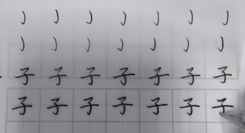 “子”字:弯钩写正,上下对正。横画左低右高,横画平分整个字。