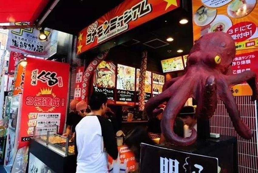 在道顿崛最有名的章鱼烧店,就是门口有个大大的红章鱼的那家。B1是章鱼丸酒吧,1层是烧章鱼烧店,2层是烧物历史馆介绍日本各种粉食文化的历史,在3层可以亲手做章鱼烧美食玩具,一节课1500円,用时1小时。