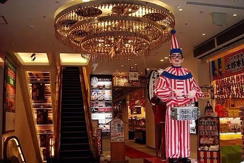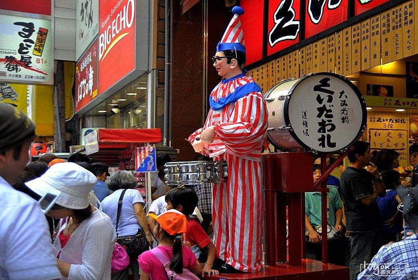 在道顿堀另外一个标志就是这位穿着红白条纹衣服,爱敲锣打鼓的的小丑。他叫“吃穷太郎”,也是大阪的标志之一。据说他从1949年起就卖力敲鼓至今。“吃穷太郎”意思是指大阪太多好吃东西了,以至于让人吃到荷包空瘪。这个小丑像实在太红,与他合影要排队的。