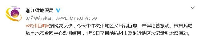 1月6日下午,多名网友反映称,在杭州突然听到一声巨响,有网友称在下沙、拱墅区等地均有听到。6日下午,浙江省地震局发布消息称,据网友反映,今天(1月6日)中午杭州地区又出现巨响,并伴随着振动。根据地震局数字地震台网中心监测结果,1月5日至目前杭州市及附近地区未记录到地震活动。