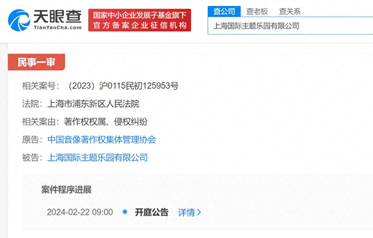 近日,记者从天眼查App获悉,中国音像著作权集体管理协会与上海国际主题乐园有限公司相关著作权权属、侵权纠纷案件新增开庭公告,原告为中国音像著作权集体管理协会,该案将于2024年2月22日在上海市浦东新区人民法院开庭审理。