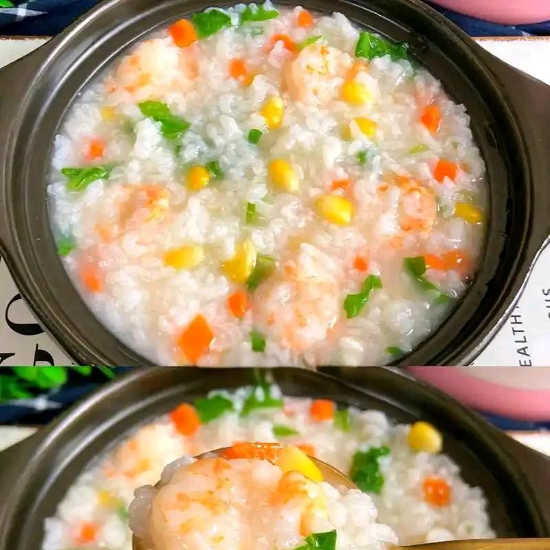 大米浸泡,虾去壳,青菜和胡萝卜切丁。锅中加水,放入大米,煮沸后转小火煮30分钟。加入虾、青菜和胡萝卜,继续煮10分钟,最后加盐调味。