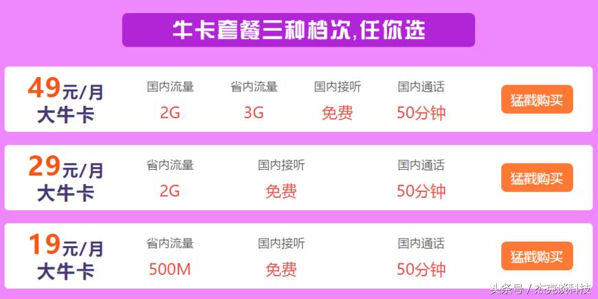 以前的时候,50元1G流量,飞X套餐48元的也才500M。这次推出的大牛卡,确实比以前套餐便宜了不少!但是比起联通的大宝卡,大王卡,大神卡的套餐情况,是否会选择这个大牛卡,确实值得用户考虑。