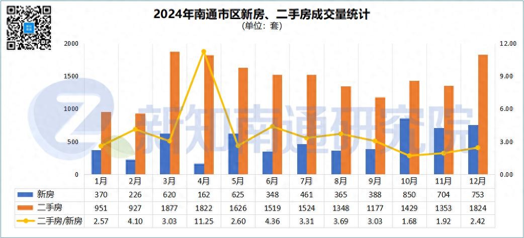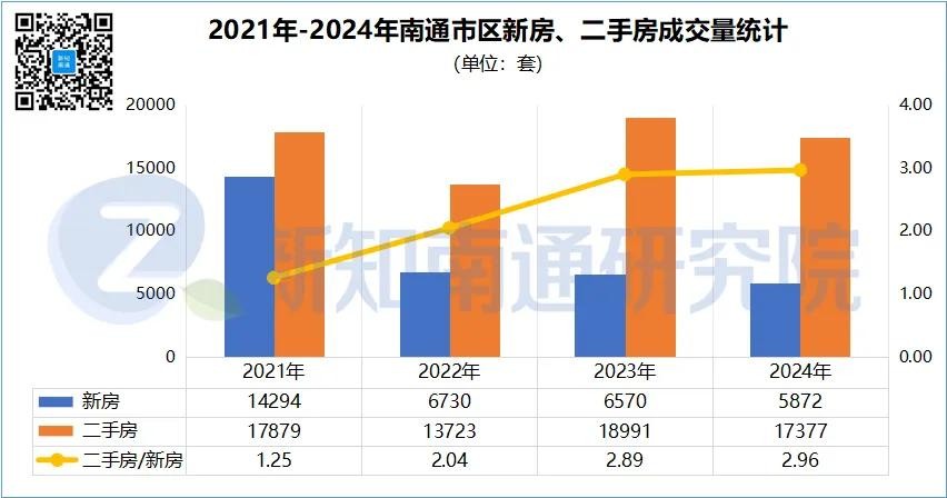 南通二手房和新房成交量“倒挂”的现象正在加剧。数据显示,2024年南通市区(不含通州区、海门区)新房成交5872套,二手房成交17377套,二手房成交量约为新房的3倍。具体单月来看,2024年有7个月二手房/新房成交量比值超过了3.0,甚至在4月份这一比值达到了惊人的11.25。