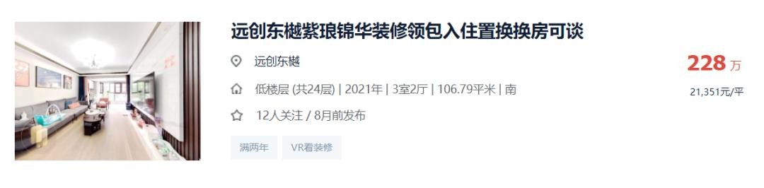 远创东樾产品分为12-15F小高层和18-24F高层两类,其中小高层买入价约2.84万/㎡,高层约2.65万/㎡,对比最新成交均价而言,房价跌幅在16%左右。目前小区共有138套二手房挂牌出售,整体挂牌均价约2.59万/㎡。部分一楼带院子特殊户型挂牌价从1.2万-1.9万/㎡不等,非特殊户型中挂牌单价最低约2.14万/㎡。