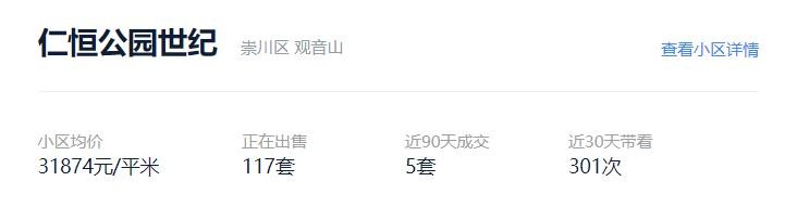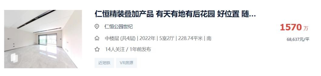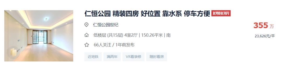 仁恒公园世纪小高层买入价约2.86万/㎡,对比最新成交均价2.48万/㎡来看,目前房价跌幅在13%左右。小区目前共有117套二手房挂牌出售,整体挂牌均价约3.19万/㎡。挂牌单价最低的是一套建面约150㎡小高层,约2.36万/㎡;最高的是一套建面约229㎡叠墅,约6.86万/㎡。
