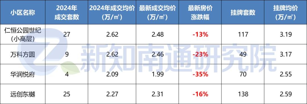 总结来看,中创老四子中,目前挂牌均价最低、成交均价最低、房价跌幅最大的都是华润悦府,唯一跌破2万大关的也是华润悦府,2024年成交量最少的还是华润悦府,可见该小区不仅价格不坚挺且流通性一般,这或许与华润悦府交付时被曝负面有关。相较而言,较为抗跌且流通性较好的是仁恒公园世纪,不过其2024年成交价呈一路下滑走势,且最新成交价已跌至2.5万/㎡以下,后续能否继续保住“最抗跌”头衔还有待观察。
