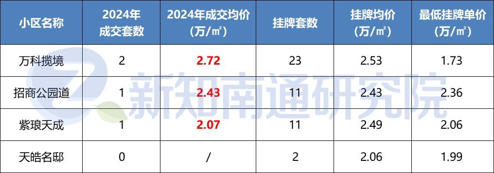 对于中创新四子,由于成交数据较少,只能从个别案例中浅析。万科揽境、招商公园道、紫琅天成均有不同程度跌幅,但都守住了2万大关;天皓名邸至今未有成交记录,但挂牌价已降至2万/㎡以下,面临较大降价压力。