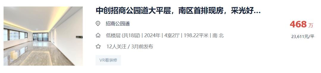 招商公园道整盘均价约2.98万/㎡,对比而言这套二手房跌幅在18%左右,总价缩水约80万。目前小区共有11套二手房挂牌出售,整体挂牌均价约2.43万/㎡。挂牌单价最低的是一套建面约198㎡户型,约2.36万/㎡。