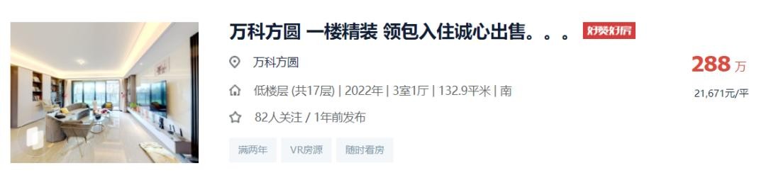 万科方圆产品为16-17F小高层,开盘均价约3.18万/㎡,对比最新成交均价2.46万/㎡来看,目前房价跌幅在23%左右。小区目前共有49套二手房挂牌出售,整体挂牌均价约3.17万/㎡,其中挂牌单价最低的是一套建面约133㎡户型,约2.17万/㎡。