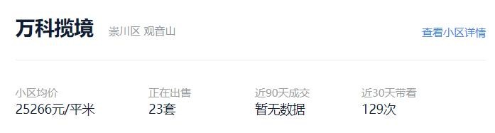 对比万科揽境2.95万/㎡的首开价而言,262㎡大户型基本不亏(不考虑其他费用),118㎡小户型房价跌幅在16%左右。目前小区共有23套二手房挂牌出售,整体挂牌均价约2.53万/㎡,其中有3套挂牌价在2万/㎡以下,最低仅约1.73万/㎡。