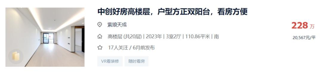紫琅天成至今也只成交了1套二手房,成交时间为2024年7月,建面约110㎡户型,成交价约2.07万/㎡。