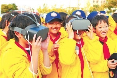安徽省淮北市首府实验小学学生在体验科普大篷车VR。万善朝 摄