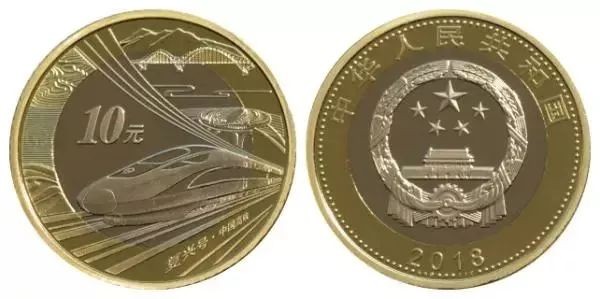 公告介绍,高铁币正面图案为国徽,其上方刊“中华人民共和国”国名,下方刊年号“2018”字样;背面图案主景为“复兴号”动车组,背景为大胜关长江大桥、北京南站、“复兴号·中国高铁”文字及高山、梯田、沙漠等。主景上方刊有面额“10元”字样。