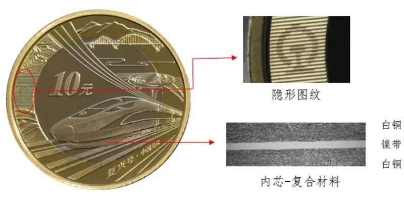高铁币外环为黄色铜合金,内芯为具有独特机读性能的镍带复合白铜材料。