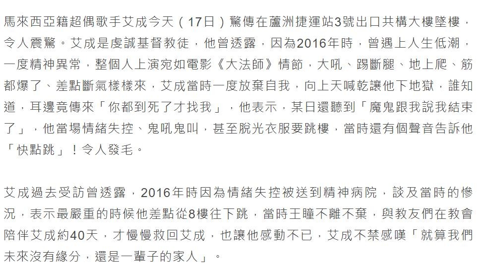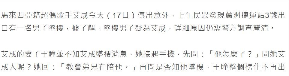 8月17日,马来西亚华裔男歌手、演员艾成(40岁)上午10点多在中国台湾芦洲捷运站共构大楼坠楼,坠落在3号出口处,当场死亡并未送医。