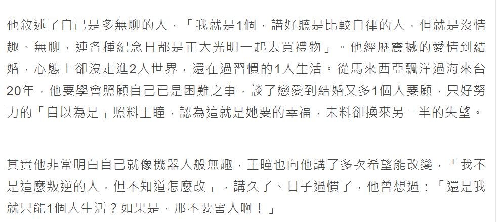 艾成说,外界觉得是他在保护王瞳,但事实上,王瞳在这段感情中付出很多,他的自我评价极低,“我就是一个,讲好听是比较自律的人,但就是没情趣、无聊,连各种纪念日都是正大光明一起去买礼物……”