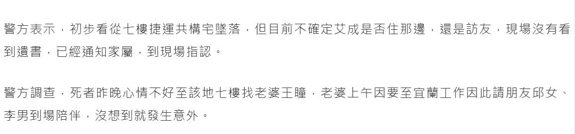 据警方透露,艾成因为心情不好,在8月16日晚到共构住宅大楼7楼寻找妻子王瞳,女方在17日早上有工作需要前往宜兰,不能陪伴丈夫,于是让教会的弟兄到场安抚艾成,不料还是无法挽回艾成的性命。