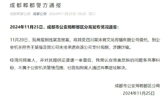 近日,成都郫都区发生了一起涉及王宝强的诈骗案件,市民钱某龙因四川某体育文化传播有限公司委托,控告王某强及其公司未按承诺支付报酬,涉嫌诈骗。此事引发了广泛关注和讨论。