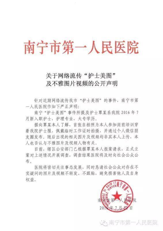 据介绍,昨日,一组关于“南宁护士”的不雅照在网上流传并引发热议,其中一张女子身穿南宁市第一人民医院护士服的自拍照令人哗然。此前,南国早报以及南国早报微信公众号对此进行报道,在沥青事实真相的同时,呼吁网友不转发、不传播相关图片和视频。