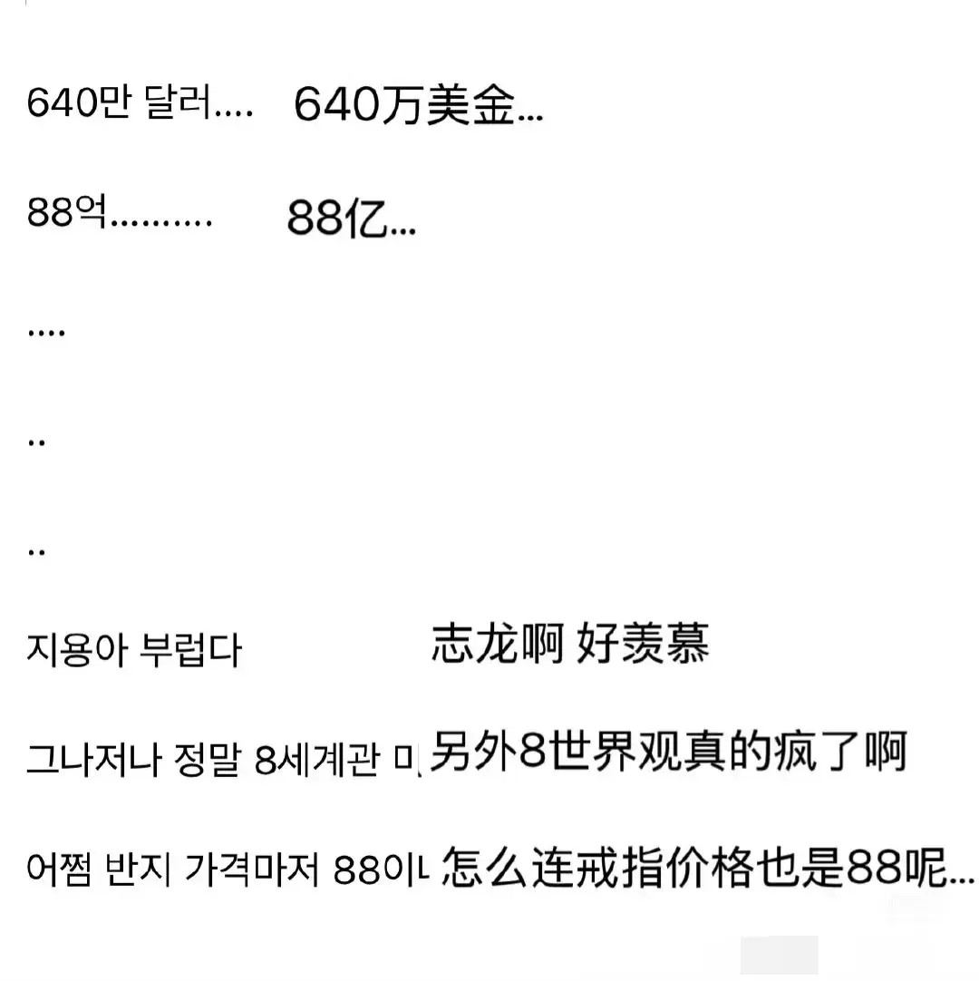 不少韩国网友在社交媒体上留言称:“权志龙真是太有钱了,这枚戒指简直就是行走的豪宅啊!”中国网友则因权志龙出生于1988年,佩戴的戒指价值88亿韩元,而戏称他为“88vip”,并调侃道:“看来权志龙是真的很喜欢8这个数字啊,连戒指都要选88亿的!”