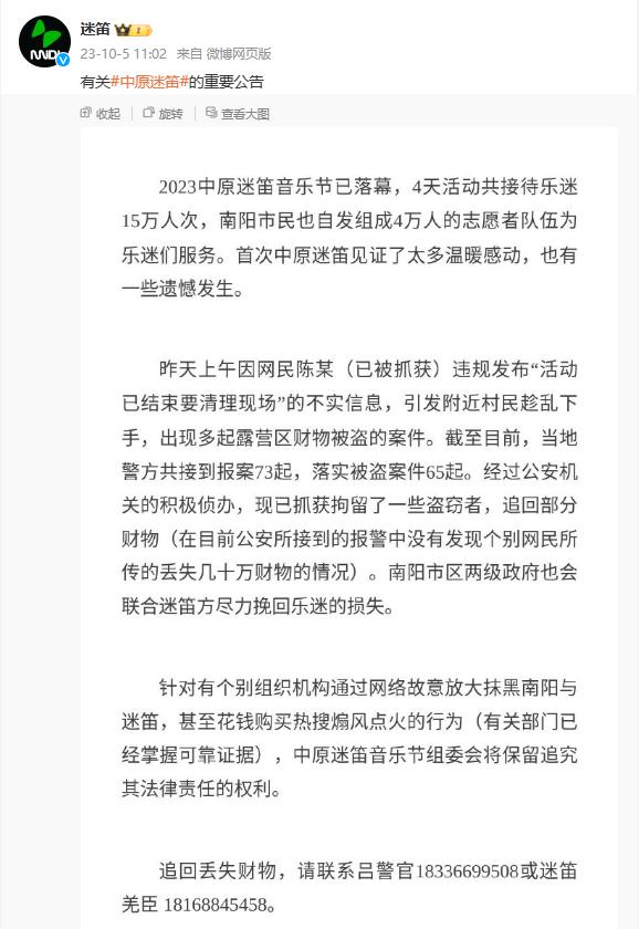 10 月 5 日,迷笛音乐节官方发布消息称:昨天上午因网民陈某 ( 已被抓获 ) 违规发布 " 活动已结束要清理现场 " 的不实信息,引发附近村民趁乱下手,出现多起露营区财物被盗的案件。截至目前,当地警方共接到报案 73 起,落实被盗案件 65 起。经过公安机关的积极侦办,现已抓获拘留了一些盗窃者,追回部分财物 ( 在目前公安所接到的报警中没有发现个别网民所传的丢失几十万财物的情况 ) 。南阳市区两级政府也会联合迷笛方尽力挽回乐迷的损失。