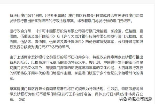据报道,澳门5月通过草案,将许可中国银行和大西洋银行发行新版的澳门元纸币.