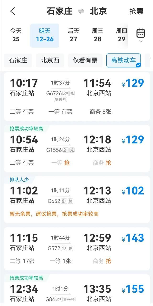 当然,坐火车往返于石家庄和北京,并不是只有155元的高铁可以选择。刚查了下12306,从北京到石家庄有K字头、Z字头和T字头的列车,而且车票也是最便宜的,价格区间是41.5-89.5元,而到达的时间大概是2个半甚至是3个多小时,类似这样的车次将近20趟。而大部分1个多小时到达的高铁票价介于102-143元之间,其中最便宜的G652票价仅102元,而且用时间只有1小时11分,绝对是性价比最高的车次,所以车票也很难抢到。